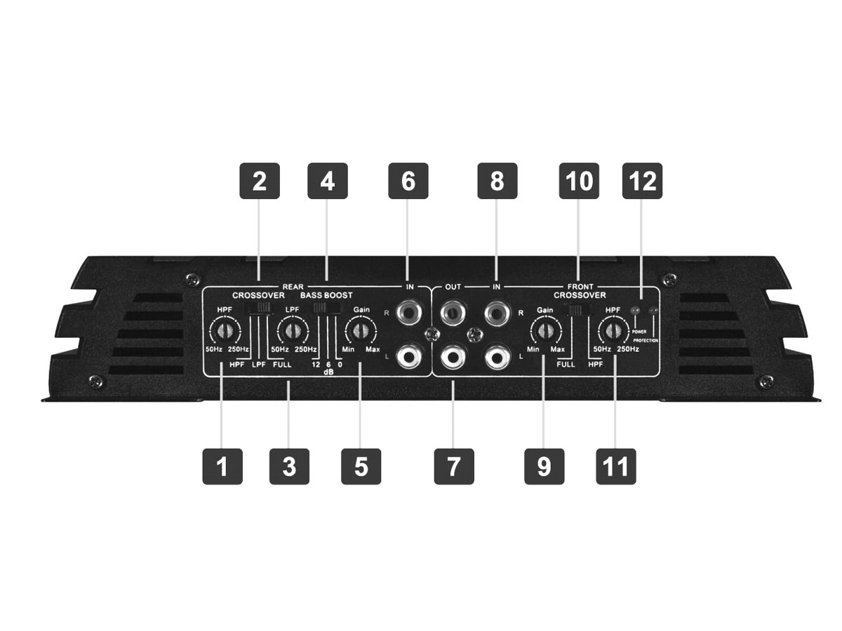 Built-in high-pass crossovers for channels 1-2 and 3-4 cut low frequencies not reproduced by the speakers. This results in cleaner, more dynamic , and distortion-free sound.