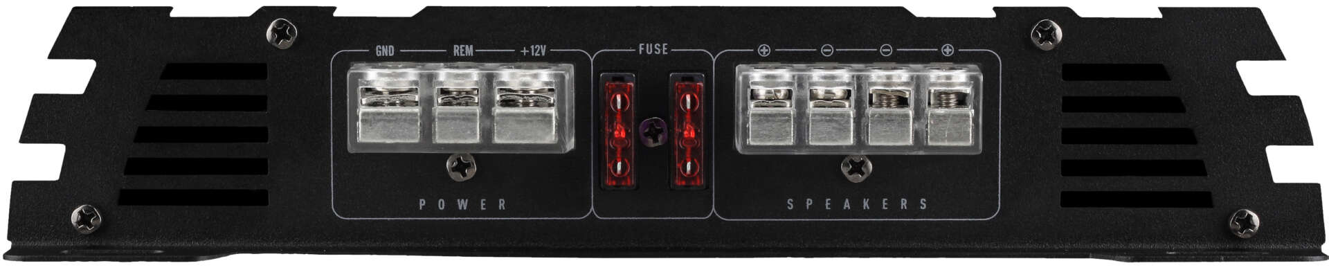 Single-channel car amplifier. 1x650 watts RMS at 1 ohm. Wired bass driver included.