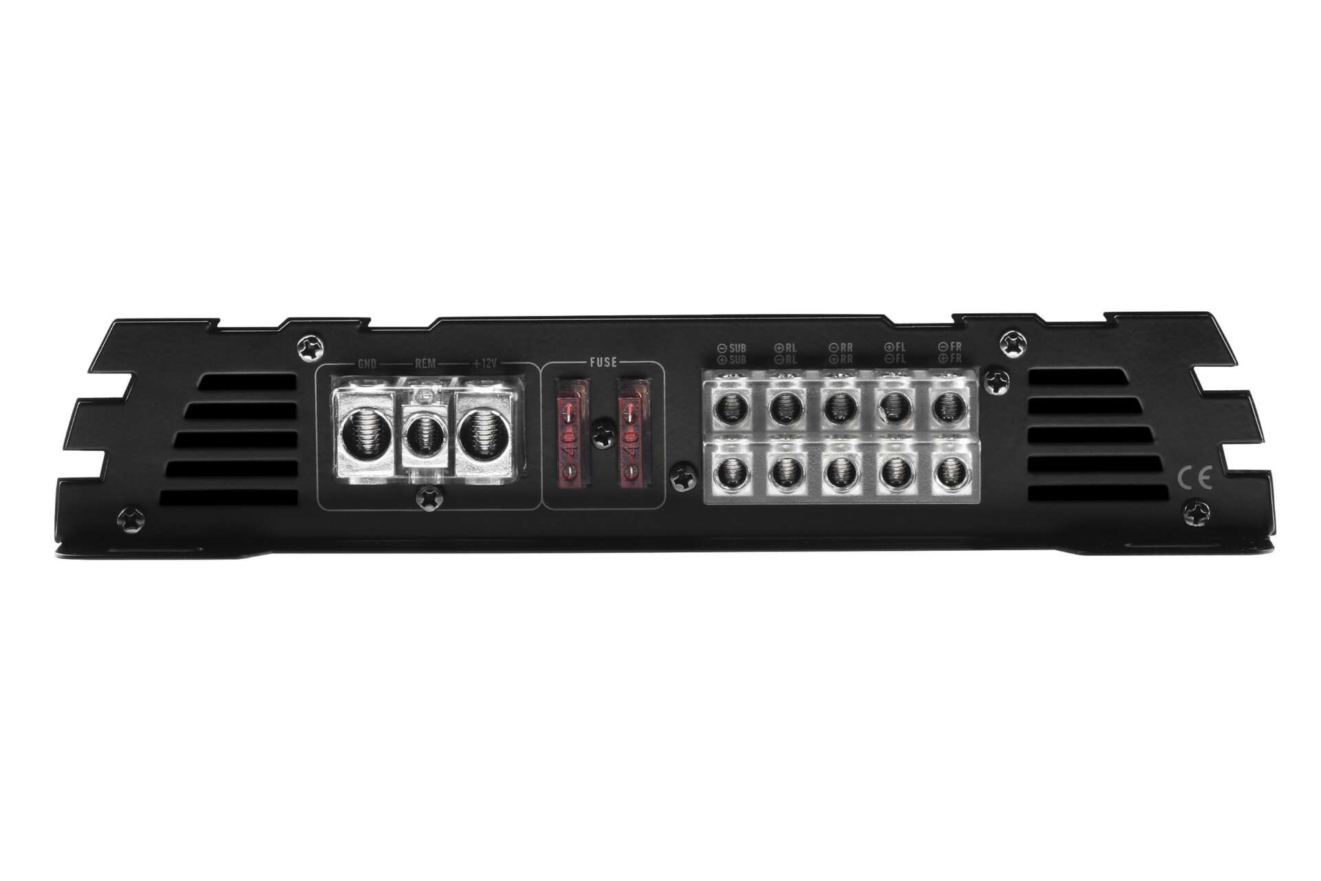 Five-channel car amplifier. Class AB/D Hybrid. 4x75W RMS power at 4 ohms plus 1x500W RMS at 1 ohm. Bass driver included.