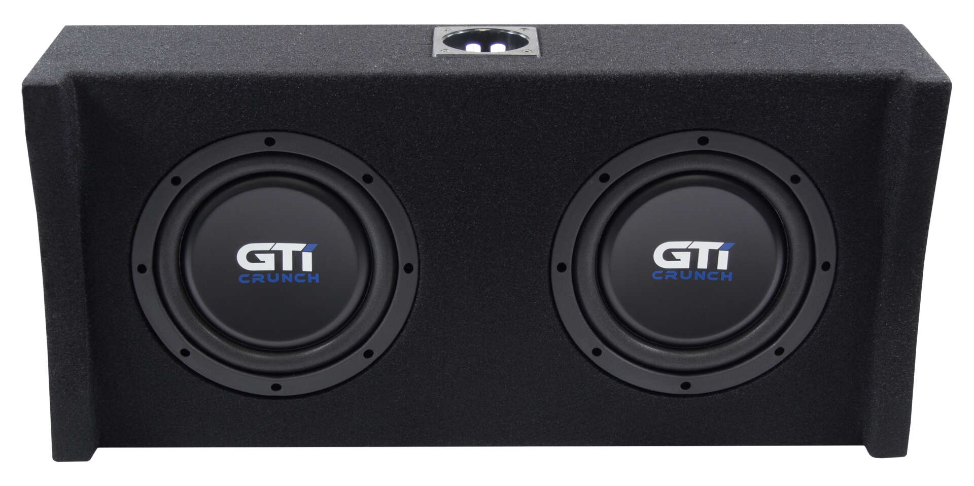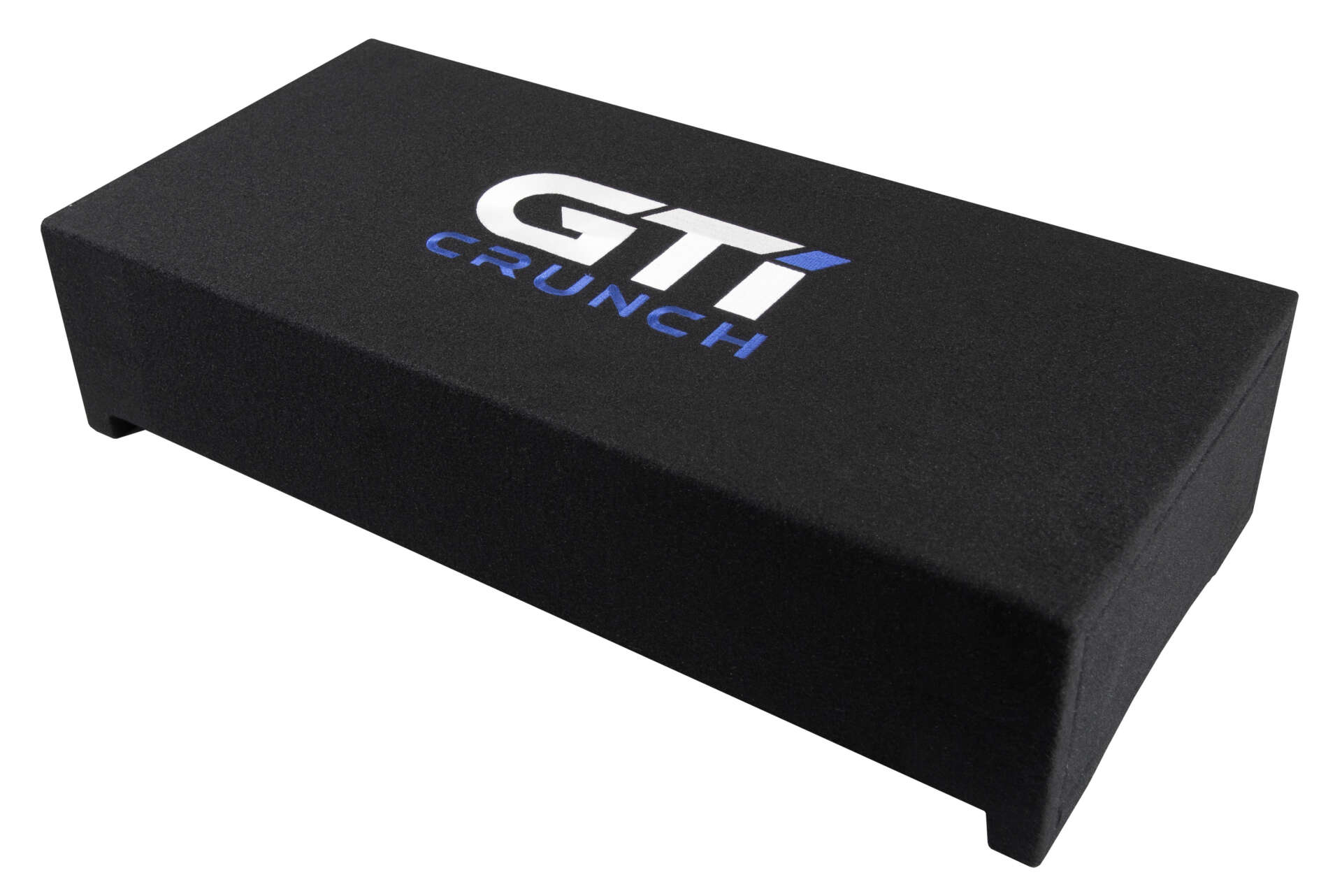 caisson de basses Crunch GTi200S est un modèle compact à rayonnement direct vers le bas , conçu autour d'un haut-parleur de graves à cône en aluminium de 20 cm et d'un radiateur passif de 20 cm .
