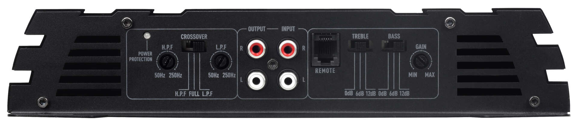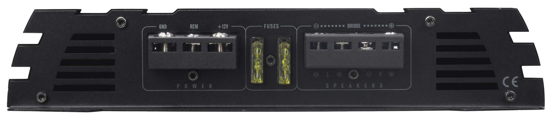 Tokanals bilforsterker. 2x110 watt RMS ved 4 ohm. Kan brokobles til 1x400 watt RMS ved 4 ohm.