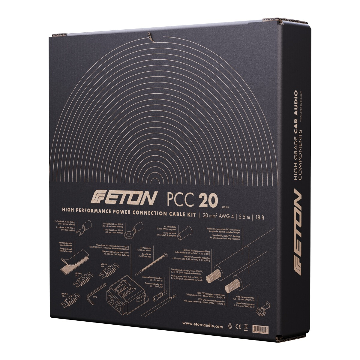 ETON PCC 20 to wysokiej jakości zestaw przewodów instalacyjnych, znany również jako Eton PCC20 – zestaw przewodów do montażu wzmacniacza, przeznaczony do montażu wzmacniaczy samochodowych i aktywnych subwooferów. Zestaw został zaprojektowany w Niemczech i zawiera wszystko, co niezbędne do szybkiego i profesjonalnego podłączenia systemu audio.