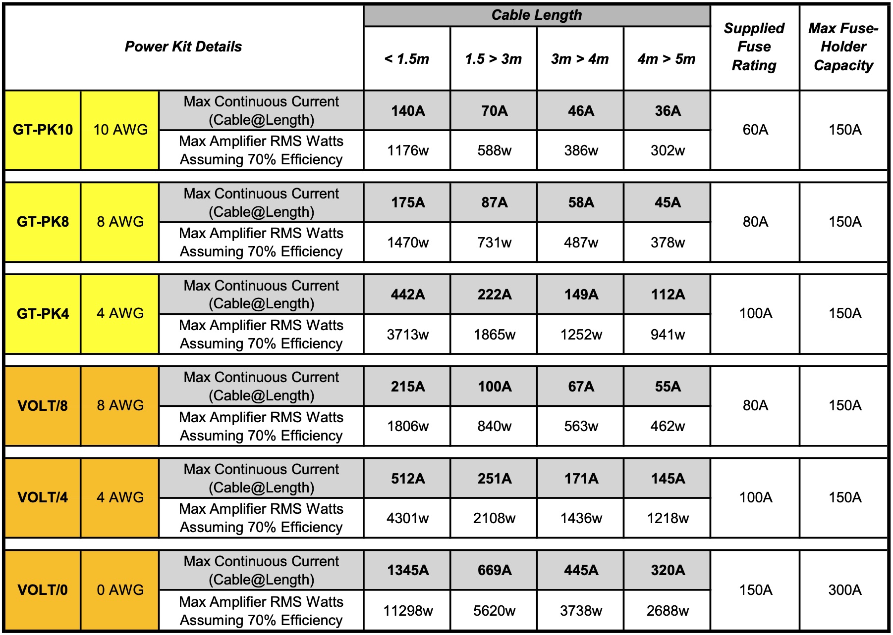 Dołączony bezpiecznik sprawdzi się w wielu systemach. Jednak, w razie potrzeby jego wartość można – i należy – dopasować, korzystając z naszej TABELI KABLI. Tabela pokazuje zmiany dopuszczalnego prądu i mocy w zależności od długości przewodu zasilającego.