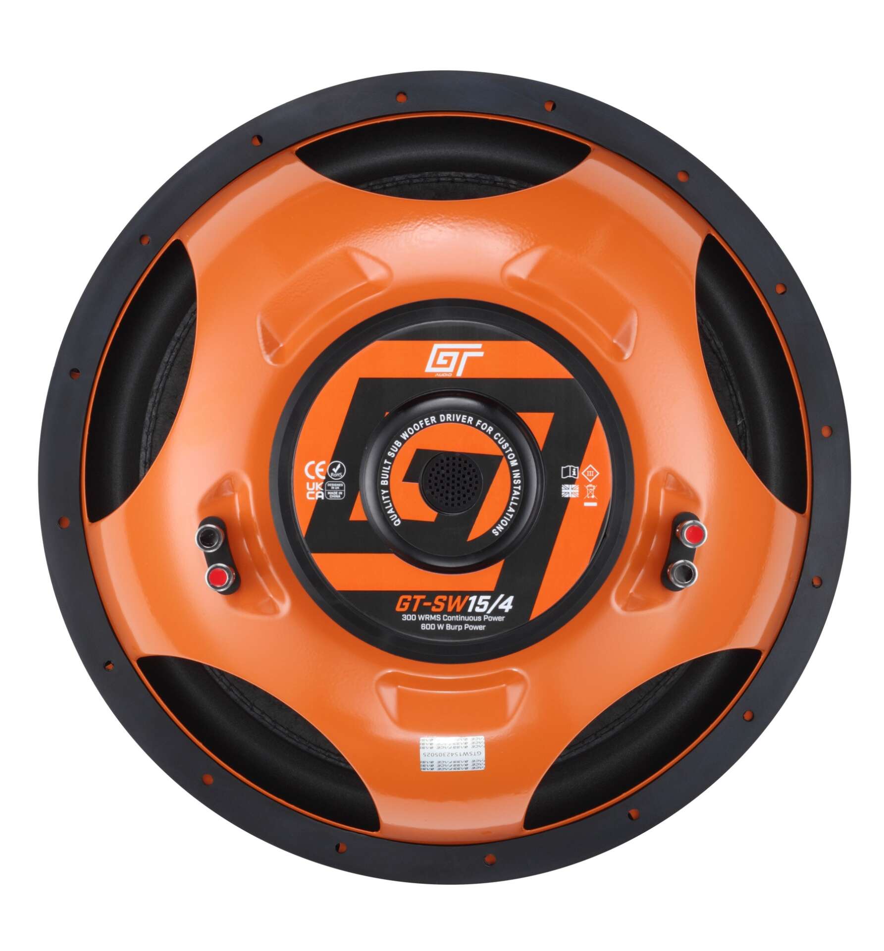 Subwoofer z serii GT o średnicy 15 cali – 38 cm. Moc RMS 300 Wat. Impedancja 2×4 Ohm.