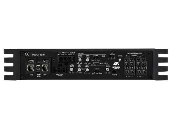 Wzmacniacz samochodowy czterokanałowy. Zasilanie 24V. Moc 4×100 Wat RMS przy 4 Ohm. Klasa D. Technologia SMD.Sterowniki basu w komplecie