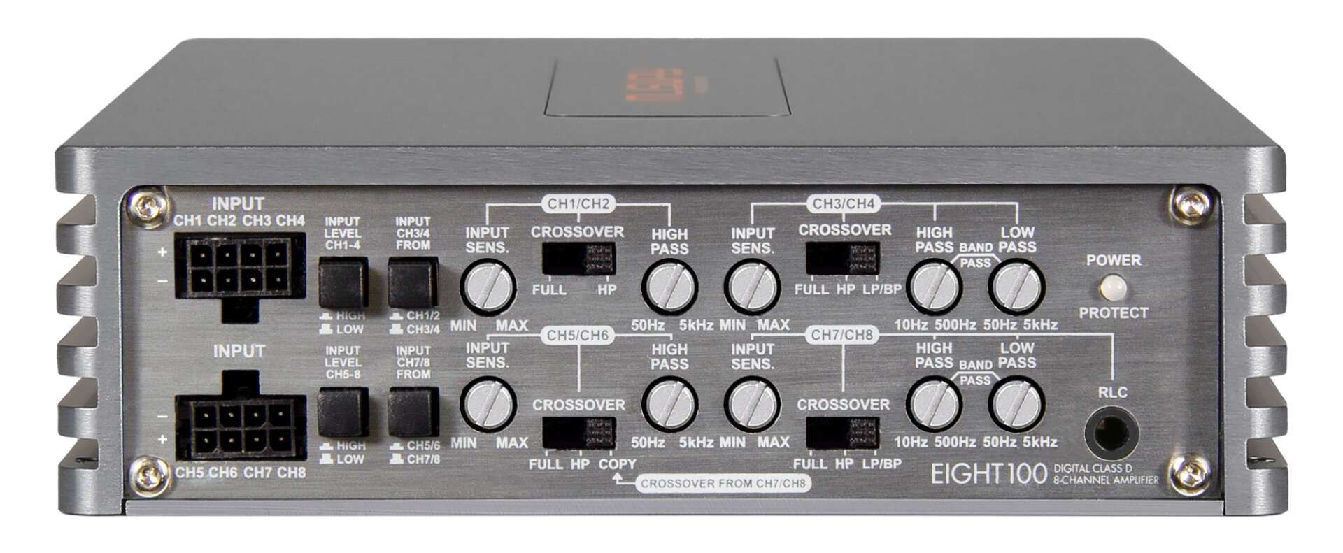 Moc RMS: 8×100 W przy 4 Ω, mostek 4×380 W RMS
