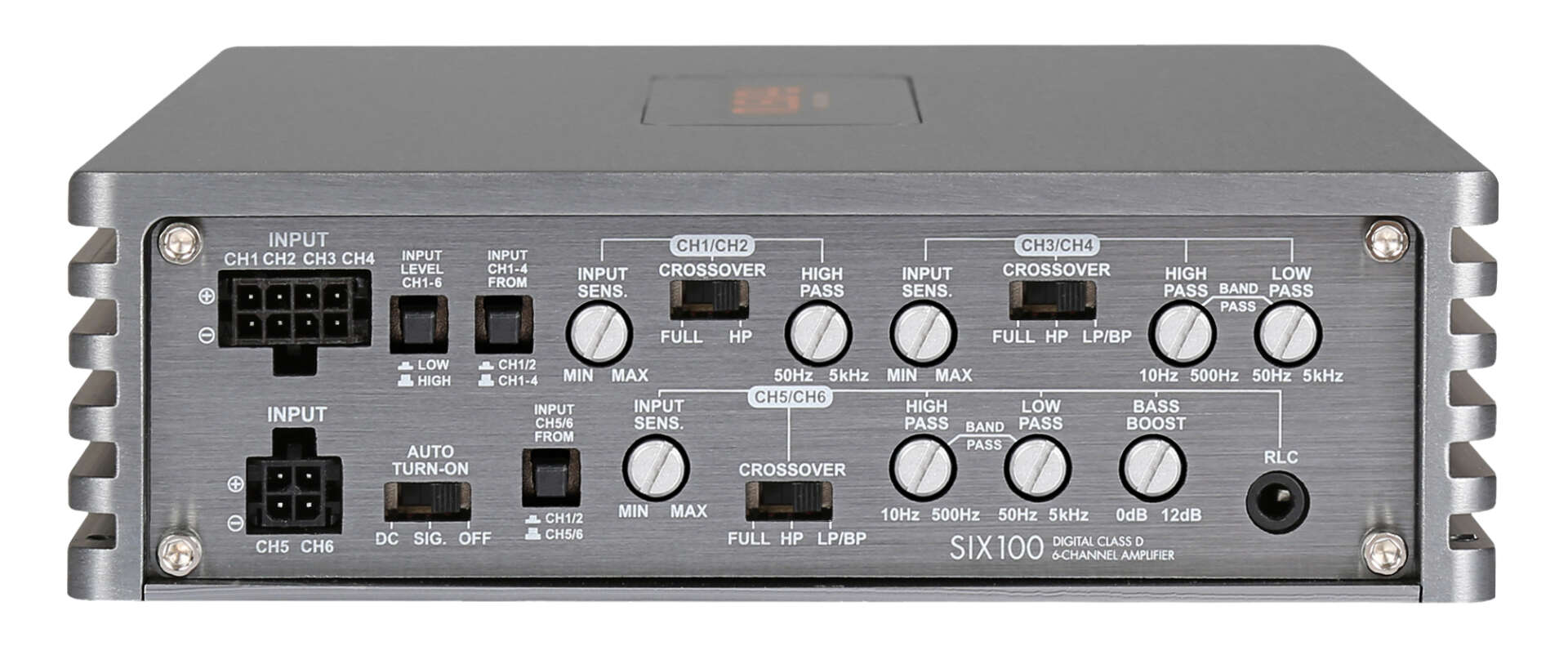 Wzmacniacz samochodowy sześciokanałowy. Moc 6×110 Wat RMS przy 4 Ohm. Sterownik w komplecie.